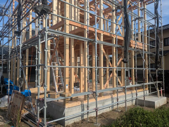 午前中には1階部分が形を取り、午後には2階・小屋組へと工程が進み、夕方には建物全体の輪郭が分かるようになりました。